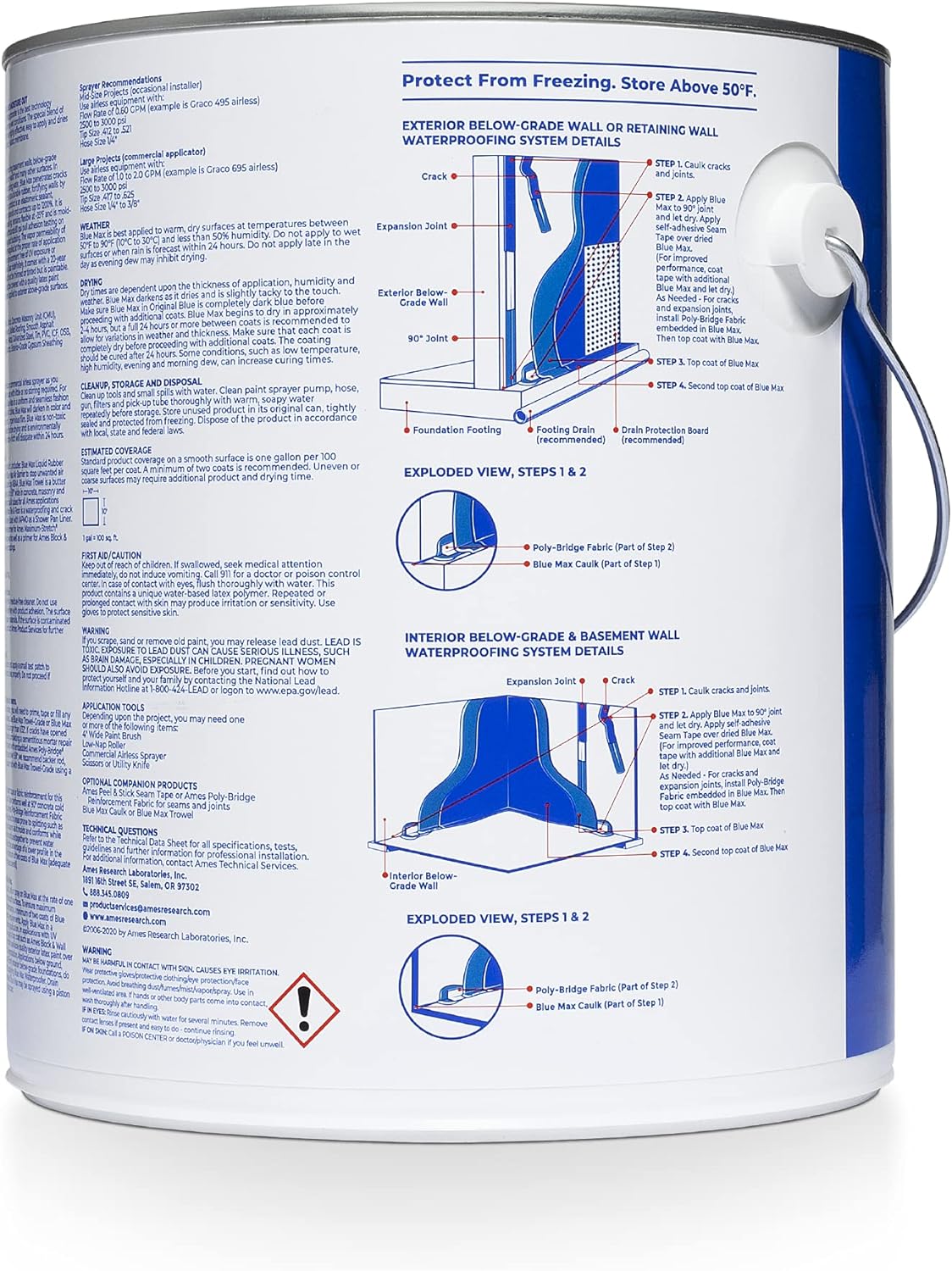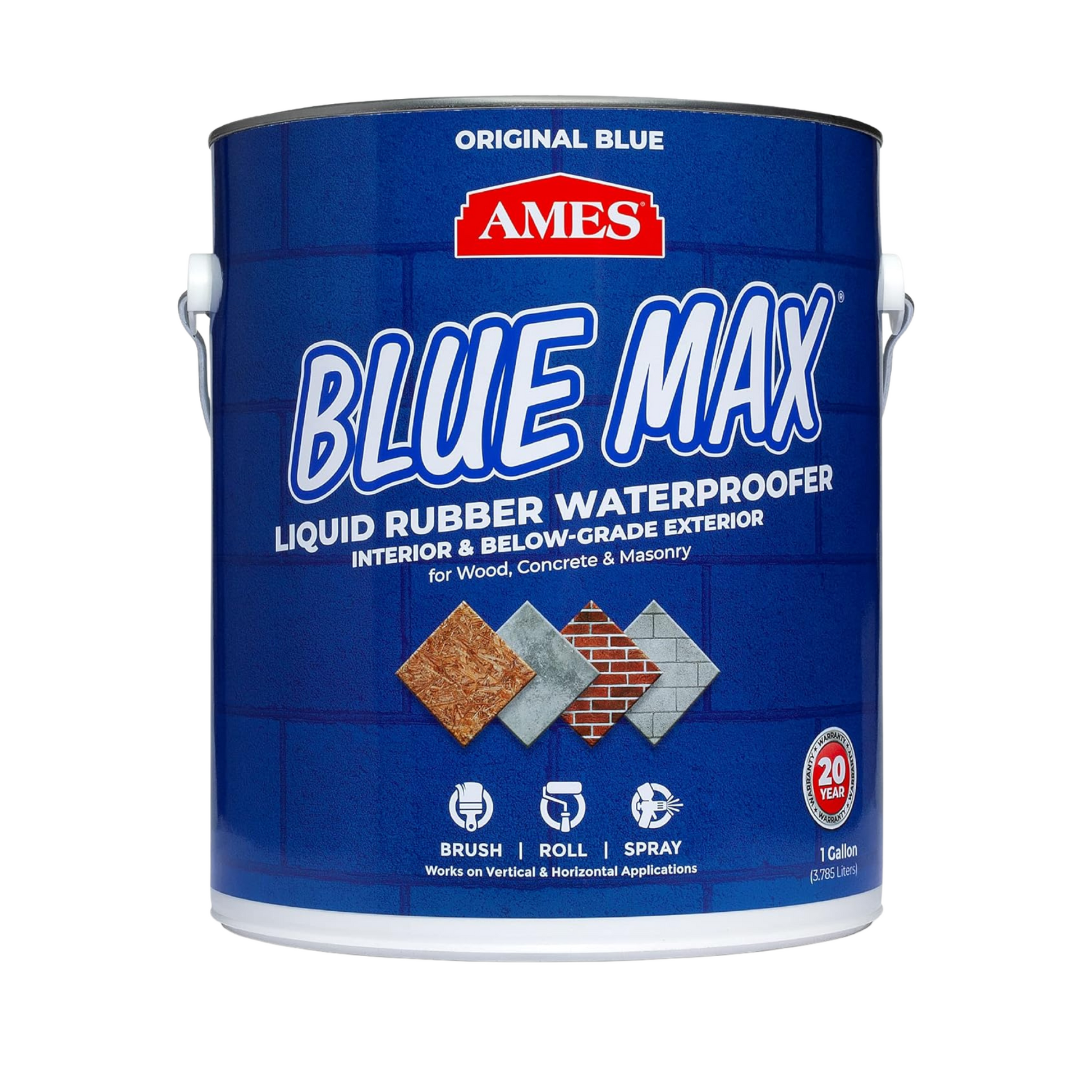 Ames Blue Max is a high-strength elastomeric liquid rubber designed for waterproofing basements, both inside and outside. It offers exceptional adhesion with 800% elongation and comes in a blue color.