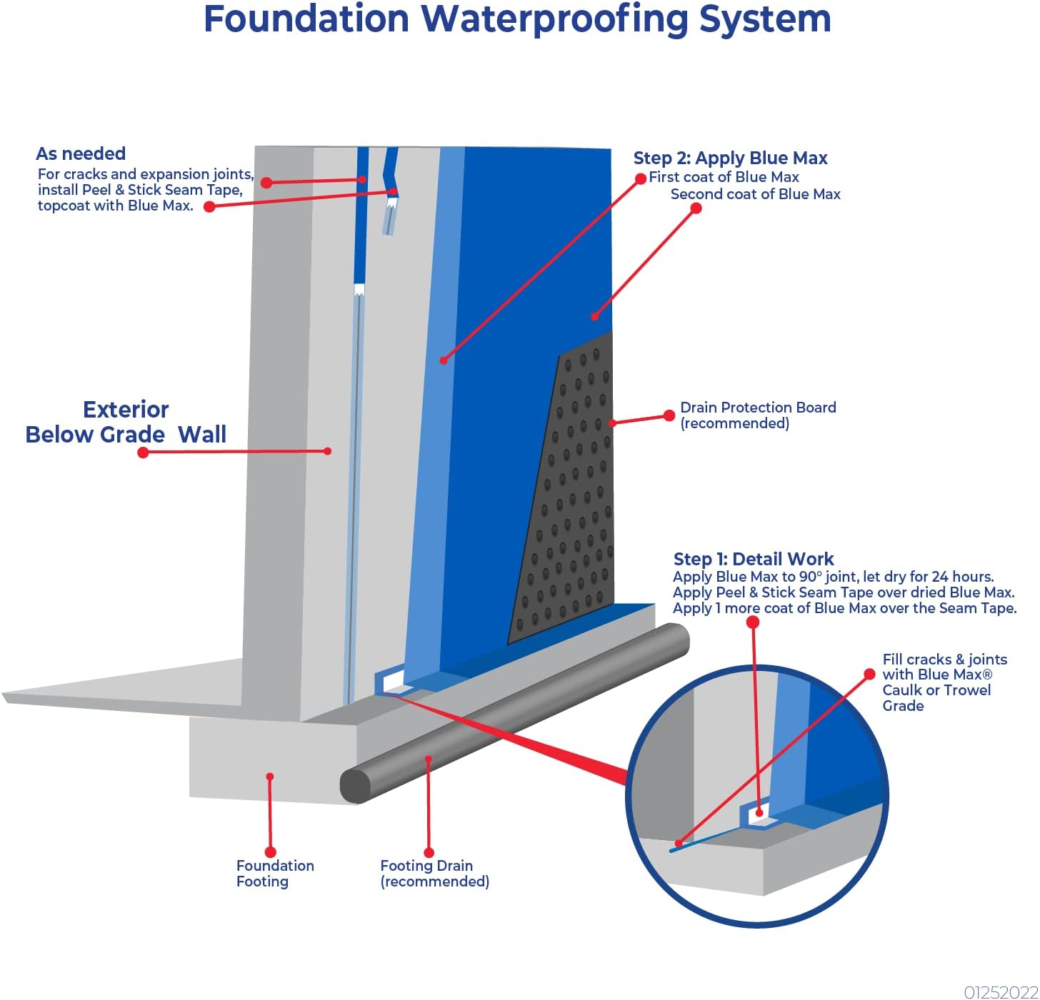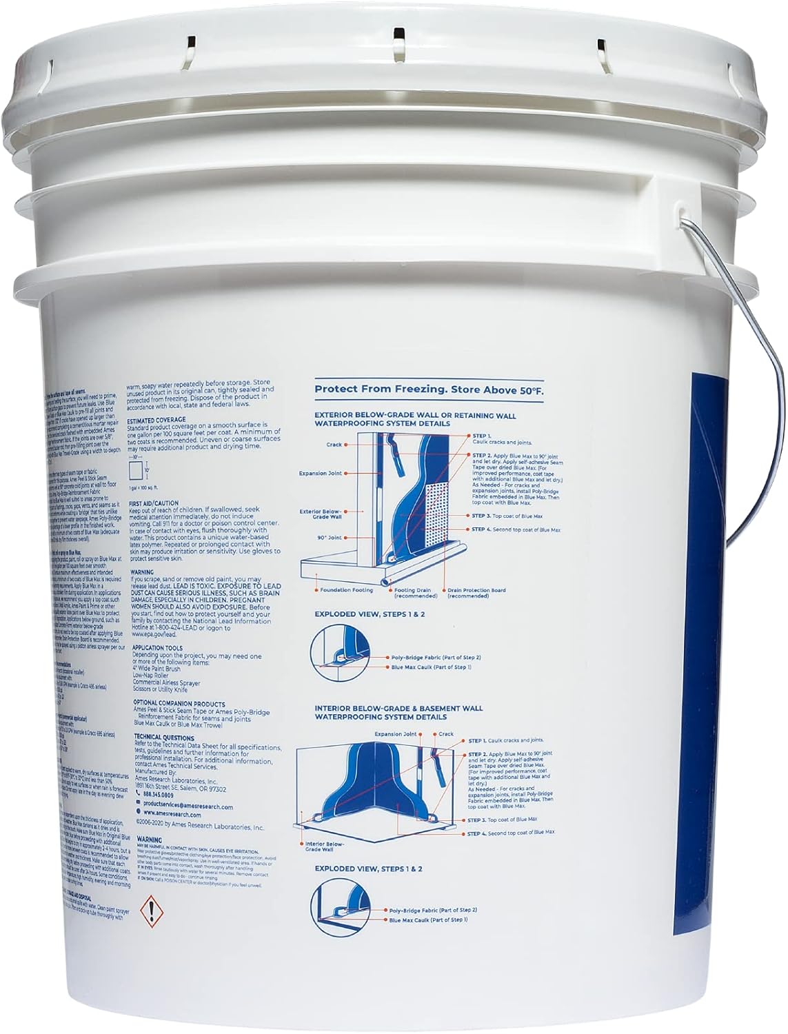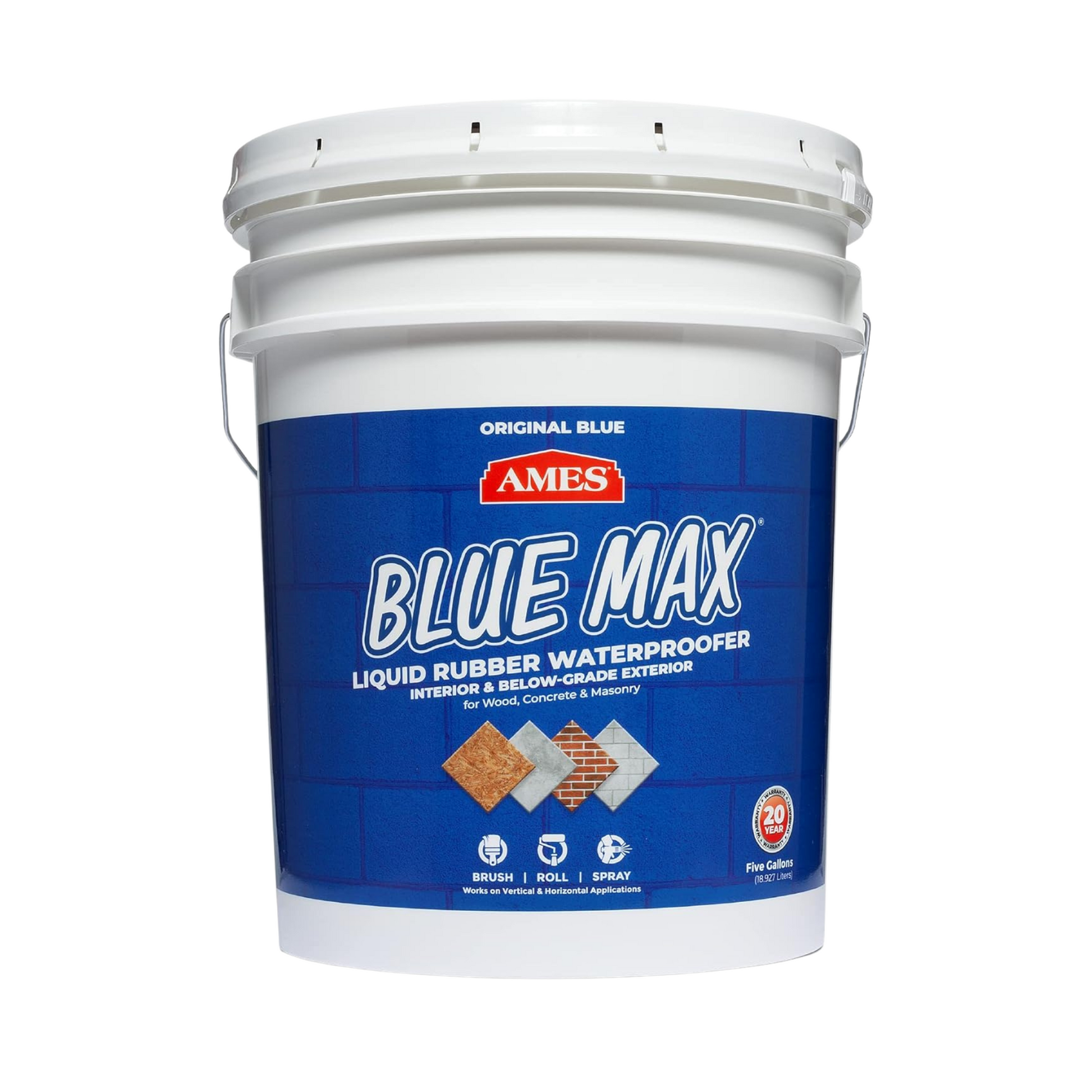 Ames Blue Max is a high-strength elastomeric liquid rubber designed to waterproof basements and other surfaces. It is highly adhesive and can stretch up to 1200% to prevent cracking and peeling.